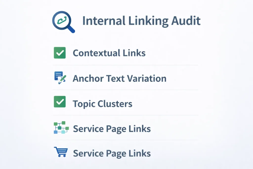 Internal linking for service pages means linking from blogs, guides, and resources to your main service pages to pass authority, improve crawlability, and increase ranking signals.