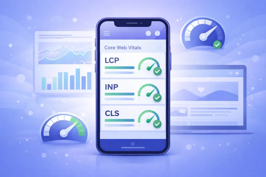 Core Web Vitals measure loading speed (LCP), interactivity (INP), and visual stability (CLS). Strong scores improve rankings, usability, and conversions.